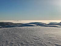 Tåka lå tungt over lavlandet, og tidvis så jeg tårnet på Kjeldeknatten stikke så vidt opp over "gryta", så da lå tåka på snaut 900 moh.