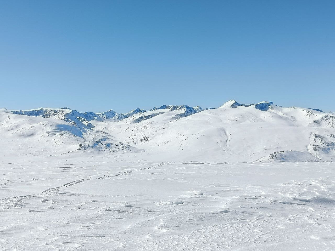 Så tidlig i sesongen er det ikke alltid lett å parkere der en vil, men heldigvis fikk jeg plassen ved Leirungvegen for meg selv; og her var det en bar flekk å stå på. Jeg hadde aldri gått opp til Heimdalshø herfra, men fordelen er at det er motbakker den hele vei til topps - og dermed enkelt ned igjen også! Ulempen er at en må starte så lavt som på 1000 meter, og i dag - som ikke var akkurat den beste dagen formmessig som jeg har hatt - skulle jeg få kjenne litt på dette oppved toppen. Nær 850 høydemeter er det å overvinne. For meg er dette "rekord" for denne vinteren.