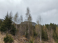 Ned mot Rauddalen i sør brukte jeg kartet på mobilen aktivt, for ikke å gå meg fast i bjørkekrattet. Det gikk strålende. Tok en god lunsj på en stein i sola nede på myra, hvor det fortsatt var ypperlige forhold, før jeg gikk opp på Gravfjellet. På veien opp fikk jeg et flott utsyn mot Bitihorn: På toppen zoomet jeg inn Rundemellen: