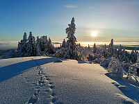 Fra Fræningen var det tråkket opp et trugespor i skogen, og med kladdinga under skiene fikk jeg i alle fall super-feste og ruslet rett opp sporet i brattlia til toppen. Mildværet var for alvor satt inn nå, og den vesle vinden føltes ikke kald en gang. Jeg hadde kledd altfor mye på meg i dag, og snøforholdene gjorde at jeg snart droppet planene om en litt lengre runde.