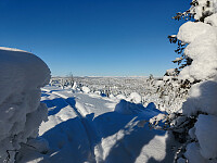 Det var tungt i pudderet opp på den lille knatten rett ved parkeringa (Tverrberget), hvor jeg ofte legger turen innledningsvis, for å sjekke snøforholdene. Snøen lå tjukk på de nedtyngede grantrærne her: