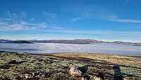 Tåke nedi bygda så det ble ganske så fint å komme opp over tåka. Fint med litt månelys og det hvite teppe over dalen. Kveldstur via Molldalsetra med Aron