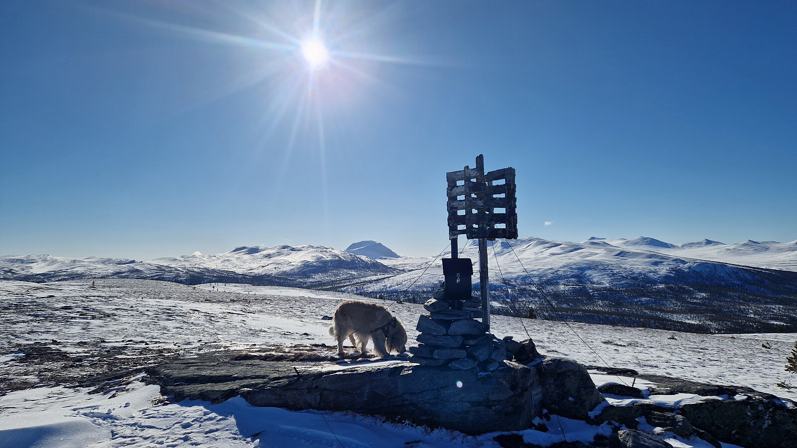 Det blir nesten så en gjentar seg selv.--> Sol ,blå himmel vindstille og påske. Kan ikke ha det bedre på toppen i dag. Burde vært på ski men siden Erling skulle ut på første trugetur med egne nyinnkjøpte truger så kastet jeg med. 8 minus på mårran så det var hardt spor. På tur ned igjen møtte vi kjentfolk. Først ei dame og litt lengere ned en dame med en hund. Veldig trivelig å treffe og slå av en prat med andre turgåere her for detver sjeldent.