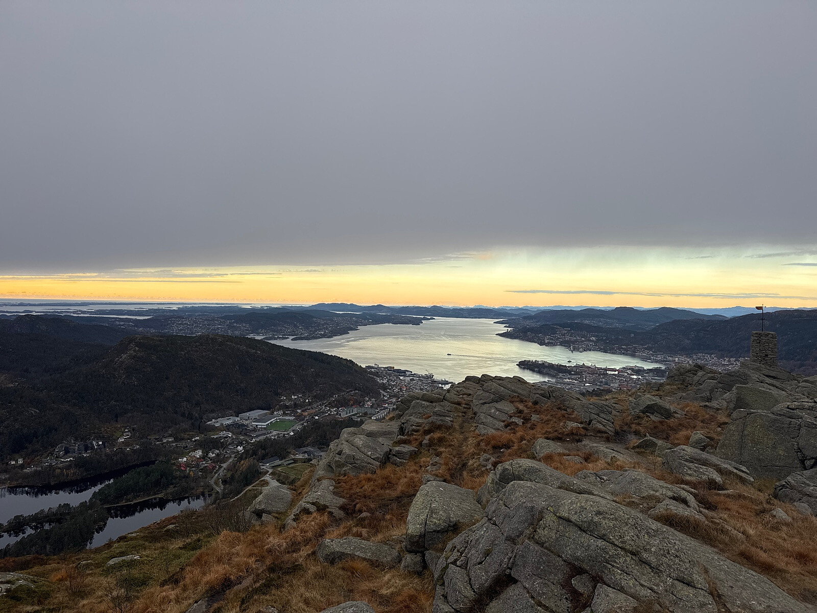 Ruskete hele dagen med i hvert fall liten storm, vinden skulle øke på fra ca kl 1800. Turte ikke kjøre over Sotrabroen for topptur i Bergen, i fall denne skulle bli stengt pga ekstremværet "Amy" og jeg i så fall "stuck" på feil side av Sotrabroen så valget falt på Liatårnet også i dag. Antok i tillegg relativt lite vind via vanlig rute pga sørøstlig vindretning. Svaiet dog godt i trærne på vei østover mot foten av fjellet, men heldigvis ikke nedbør av noen betydning. Relativt rolig opp fra Bjørkedalen, mens lenger oppe uberegelige kastevinder. Siste stykket opp nesten vindstille i hvert fall tett inntil den nord-sør løpende toppryggen. Turte ikke klyve opp den vanlige ruten via rennen rett under toppen da jeg fryktet plutselige vindråser kunne kaste meg >>>