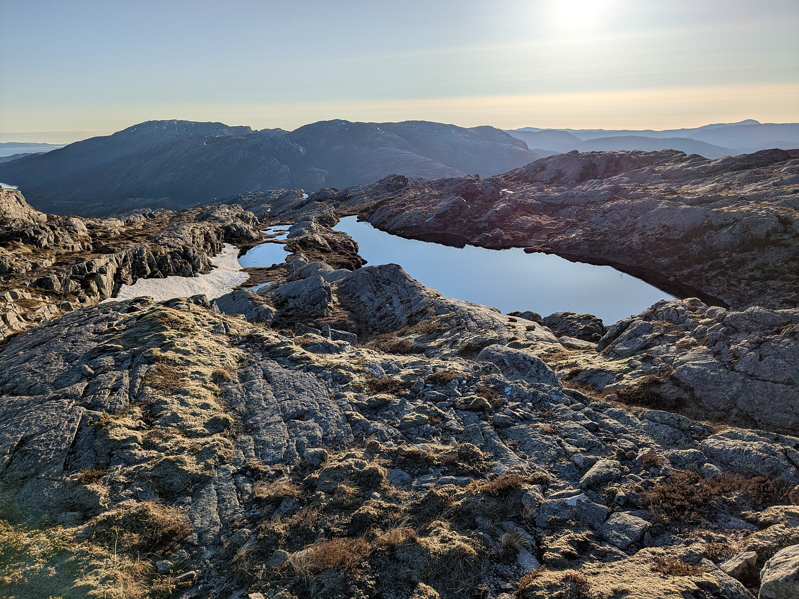 Sesongens siste skitur? Jeg kjørte til Nordli, Kvelia, og en snartur via Sverige til Tunnsjøen og videre inn på grusvei til Geitseter ved Ingulfsvann. Parkerte ved Geitseter, litt privat men ingen folk å se. Gikk langs vatnet, og over ei bru over Kvennbekken. Ikke skare i dag, og lite gjennomslag. Lett opp mot Løysmundklumpen , men mot toppen var det kommet nysnø som klabbet fælt. Varde og flott utsikt mot Tunnsjøen og Gudfjelløya. Sol og fargerik himmel i dag. Videre sørover mot Storfjellet, høyeste i dag. 888 moh. Men på nordsiden av Storfjellet var det meget krevende og bratt for å komme opp. Hard skare øverst. Forsøkte å komme opp flere steder, tok av skiene, men skisko egner seg dårlig som klatresko. Kom opp til slutt. Varde på toppen, flott utsikt over Havdalsvatnet. >>>