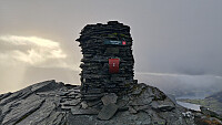 Fikk endelig kontaktet en lokal som er ofte på sjøen om skyss til Skorpa. Jeg hoppet på land ved Gulen, og gikk opp den nærmeste hyllen. Det starter med veldig mye vegetasjon, og det blir svaberg etter 100 moh., det var heldigvis tørt nok idag. Litt opp og ned, så var det tydelig rute til toppen. Veldig flotte skyer i dag, fikk ikke noe regn selv om det var meldt. Til Stonga var det sti, noen har visst ryddet en løype opp den øverste skaret. Trær og busker har blitt saget. Den fortsetter visst østover nedover Stonga, men fikk ikke tid til å sjekke det ut. Det var fortsatt litt tøft siden det var glatt og vått.