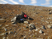 Tur alene. Nydelig vær, blikkstille og sol. Men mye nysnø i høyden. Noen steder bærer den, noen steder ikke, men for det meste bærer den nesten. Det blir krevende ned ura fra Søndre S. til oppgangen mot Midtre S. Ned her bruker jeg lang tid. Også ned fra Midtre S. må jeg trå varsomt - nysnøen dekkere ura og dens mange hulrom. Lite dyreliv å se bortsett fra sau og tamrein og noen få turister på T-stien. Ikke ei rype på hele turen!!