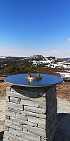 Denne dagen ville vi ta en tur til Kvitfjell. Planen var en runde på tre topper, men kona var sliten etter to turer nå og hadde tunge bein. Når også været ble et helt annet enn det vi hadde "bestilt" var det lite "guts" igjen hos henne. Det snødde faktisk der oppe i hyttefeltet der vi parkerte. Jeg håpte jeg iallefall kunne få henne opp til toppstasjonen med sikteskiva samt bort til Segelstadkampen. Det gikk veldig greit og været bedret seg mye. Sola tittet fram og temperaturen steg. Nærmest vindstille også og vi tok matpause der oppe.