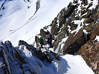 Tredje og siste dag på Peakbooktreff II og etter to dager med rufsete vær på fjellet ble vi belønnet med et drømmevær; knallblå himmel, sol og nesten ingen vind. Dagen før hadde  mortenh (Morten Helgesen)  tipset meg om at  senfterberg (coni häusler)  skulle ha en tur med innslag av klatring/bratt snø og kanskje jeg ville bli med på den. Jeg hadde opprinnelig tenkt å være med på fellesturen over Urdadalsryggen men denne muligheten virket for godt å la være da jeg skjønte at turen hadde potensial til å bli over gjennomsnitt artig og Morten vet en ting eller to om turer i Jotunheimen ikke sant? ;) Tilfeldigvis traff jeg begge to tidlig på søndagen og snart fant jeg ut at planen var å gå/klatre opp østeggen på Sokse med avgang kl.8 fra Leirvassbu. Da ble det en kjapp frokost på meg og etter å ha fått lånt en hjelm fra Morten >>>