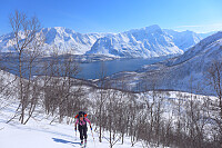 Med det strålende påskeværet som var meldt denne uken dukket det opp en fin anledning for å få til en tur til Store Kjostinden i lag med Kine, noe som vi hadde snakket om helt siden vi ble kjent med hverandre. Første ferga fra Breivikeidet gikk kl.10 i dag, noe som vi synes passet greit da snøforholdene i fjellet var noe preget av solskare i sørsider for tiden, uten at det ble noe bløtere om dagen siden luften var fortsatt så kjølig. Vi derfor vurderte en noe sein start - og faren for våte løssnøskred, å ikke være problematisk på turen i dag. Jeg traff Leiv og Kine på fergeleiet hvor jeg fikk hoppe inn med dem på turen videre til parkeringsplassen mellom de to tunnellene like før Lyngseidet. Da vi hadde gjort utstyret klar for tur var det omtrent kl.11 da vi begynte turen >>>