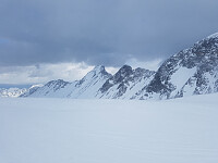 I dag var forventningene litt lave ettersom det hadde vært mildvær til over 1200 moh dagen før og skydekket lå langt nede i fjellsidene da vi kjørte innover Isfjorden mot Dalsbygda. Gleden ble derfor stor da det viste seg at det lå 10-30 cm tørr nysnø fra 550 moh til topps og været lettet på vei opp den nordvente dalen mellom Kvanndalstind og Kvanndalstind Øst. Rått føre og bra turfølge ga påskas høydepunkt så langt.