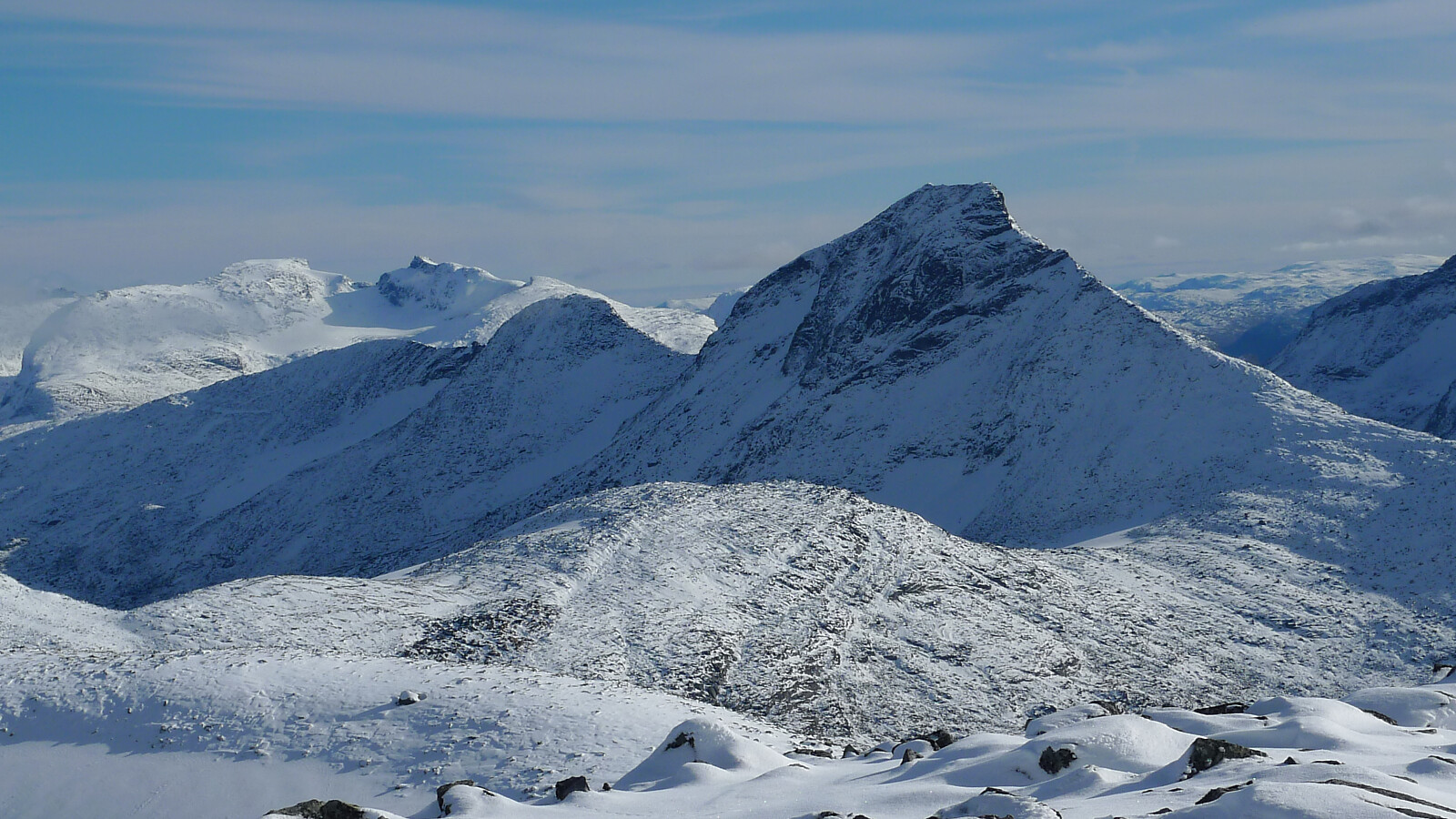 Astrid og jeg kjørte fra hytten på Mjølfjell kvelden i forveien, og overnattet i Røldal. Værmeldingene for denne dagen var perfekte med sol og lite vind, men en viss usikkerhet om snøforholdene i høyden. Vi startet fra Valldalen Parkering kl 0845 og fulgte god grusvei nesten helt frem til den selvbetjente DNT hytten Middalsbu . Mange biler hadde parkert før og ved Middalsbu, de må ha hatt nøkkel til kjettingen som sperrer veien nede ved parkeringen. Så heldige var ikke vi. Vi krysset elven på bro like øst for Middalsbu, men valgte feil sti i starten idet vi valgte >>>