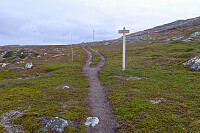 Overskyet oppholdsvær og noen kuldegrader var værprognosen for dagen, og slik ble det. Nær toppen på Gáranasčohkka er det bygget en svær sivil flyradar for å øke flysikkerheten i området. Radaren kalles Kirkenes radar og var klar til bruk i 2011. Av den grunn er veien/stien hele veien opp til toppen meget godt merket med stolper og tegn på hvilken retning du går. På første del av turen omtrent til 152-vannet er det også firhjulingspor. >>>
