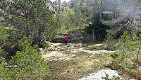 Vi gikk så ca. 30 m lenger sør for å undersøke et annet objekt som er synlig på 1951 flyfotoet. Dette viste seg å være en stor stein med en rusten jernkrok. Uvisst hva dette har >>>