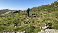 Fra 1167-varden er det slakkere terreng, men mye stein videre oppover mot Mjølfjellet Nordvest . Her er det varde med turbok der vi skrev oss inn og trig-punkt som markerte grensen mellom kommunene Voss og Ulvik. GPS-koordinatene lå noen meter fra varden, og er justerte. >>>