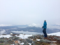 Etter øyhopping i ytre var det greit å stoppe ved Brattvåg for å få strekt ytterligere på beina. Tett snøvær ved starten fra Synnalandsvatnet. Jeg fulgte merket sti oppover mot Store Hestevatnet. Jeg tok av fra stien litt før jeg kom opp til vatnet og gikk i retning Heimste Synnalandsheia. Etter en stund kom jeg inn på den merka stien, men her var ingen dagsferske spor og snødrevet var nokså tett. Det var derfor bare å sikte seg inn på kursen mot høgste punkt på gps.