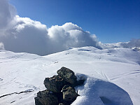Været skiftet utallig fort. Ene øyeblikket var det hett og flott med stekende sol, i det neste haglet og snødde det vannrett etterfulgt av noen kraftige vindråser. Det var defor inget blivende sted og etter litt fotografering og signering i trimboka var det bare å begi seg nedover igjen . En fyr hadde skrevet seg inn 66 ganger i år, det er jo hakket verre enn meg og Lotsbergnibba :-)