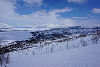 Kjørte til Skardmodalen frem til Nybrott hvor vi parkerte nede ved gårdveien. Fin tur oppover lia etter scooterspor til Skardvatnet, vi gikk etter vatnet ett stykke før vi tok av og fulgte bekkedalen oppover lia. Videre lett gått innover Austre Skardvassdalen og opp ryggen til Arefjelltoppen lang pause her ved varden med noe godt å bite på for hundene og oss. Lekende lett nedkjøring tilbake til bilen. Atter en fin dag her i nord.