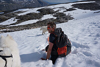 Fin tur til kjære og kjente topper, vi hadde ikke bestemt oss helt om vi skulle ta denne runden da vi startet, ville se an hvordan været utviklett seg. Fulgte turistløypa opp til Blåhøa her oppe var det stri sur vind så luer og votter var greit å ha på. Ble ikke lange pausen her før vi fortsatte videre og ble enige om at vi skulle ta en avgjørelse når vi var på Riaren om vi skulle fortsette runden til Gjevillvasskamban. Mørke skyer kom og gikk så det fristet å fortsette. Vi gikk opp ryggen til Nordre Gjevillvasskammen og videre lett opp til Store, lang pause her før vi tok fatt på snøvandring opp på Indre kamben. Fra toppen her ble det lett masj ned til Hyttdalen og videre ned til Vassendsetra. Siri fikk en lang pause her mens jeg fylte opp proviant og ryddet vekk søppel >>>