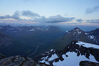 Besøk til Tromsøs landemerke Tromsdalstinden i ymse vær, litt regn og sur vind på toppen. Gikk opp etter sommerstien, greit turvær helt til vi skulle opp siste ryggen da kom de første regndråpene. Søkte ly bak den store varden og fikk i oss litt mat før vi returnerte ned samme veien som opp.