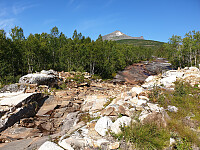 Kjørte rundt til Nordfold og til veis ende ved Sagen. Gikk innover stranda langs fjorden. Bare sporadisk sti, men mye lettere å gå enn fryktet likevel. Fine hytter på Gravneset. Brukte ca. en time inn til Stordalen. Pause ved elva, Bamse fikk drikke og kjøle seg ned mens vi åt. Fortsatte opp dalen i åpen skog til ca. 100m, der fant vi et fint sted langs elva for å sette igjen Bamse, som vi mente var for sliten til å bli med til topps. Men det fant han seg høylytt ikke i, så Egil gikk tilbake og lot han bli med. Ganske greit i starten videre, men kom inn i litt kratthelvete et stykke opp i lia. Gikk etter spor fra Peakbooker Waaktaar. Åpnet seg fra 300-400 meter. På ca. 550 kom vi inn i et lite juv med enorme kampesteiner. Fikk heldigvis med oss at ruta gikk opp en liten kamin til >>>