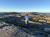 Startet i grålysningen. Kupert landskap første km. Deretter nokså bratt før lettere terreng mot to jamnhøye punkt. Fikk øye på en vardet rute ned igjen.