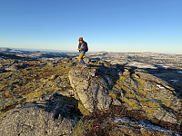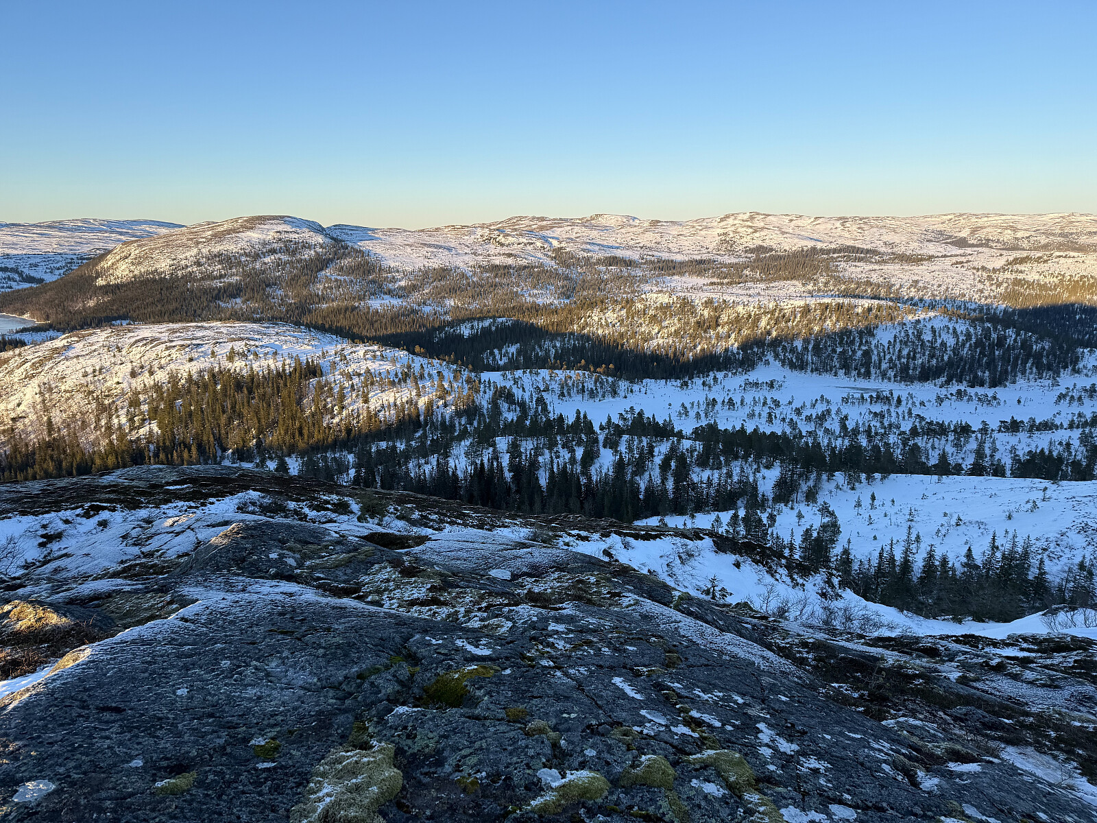 Startet i grålysningen. Kupert landskap første km. Deretter nokså bratt før lettere terreng mot to jamnhøye punkt. Fikk øye på en vardet rute ned igjen.