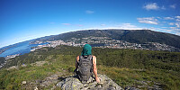 Hedda og jeg gikk fra Fisketorget, opp Fløyen og videre til Brushytten. Vi bestemte oss for å gå mot Ankerhytten. Da vi kom dit fortsatte vi videre oppover og fulgte en sti et stykke til vi kom ned til Sandvikshytten som er åpen på søndager. Fortsatte nedover og bestemte oss for å gå bort til Ørneberget. Aldri vært der før og dette stedet kommer høyt på lista over flotte utsiktspunkt i Bergen.