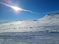 Etter at jeg brakk skistaven i går, ble det tur til Skei i dag for å kjøpe nye skistaver. Etter butikken ble det skitur fra Fjellandsbyen i et aldeles nydelig vintervær. Gikk over Prestkampen og Slagsfjellet. Noe vind over toppene.Ganske tung brøyting utenom løypene, og litt vondt å kjøre utfor, da det utenfor løypa vekslet mellom skavler og djup løssnø.