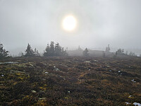 I dag ble det tur til Prestkjerringa, og for første gang i år startet jeg hjemmefra. Jukset litt, i og med at jeg syklet opp til Hakkerudsvea. Veldig vått i terrenget, og gikk kliss våt på føttene hele turen. Råket fra Skårsetra til Nysetra er snart ufremkommelig, masse vindfall, burde absolutt vært ryddet. Etter at jeg hadde krysset Djupåa ble det litt snø i råket, men aldri mer enn noen få cm. Veldig sleipt og glatt enkelte steder. Like før Gammelhans ble jeg nådd igjen av Åge Leine, som hadde gått fra Værskei. Det ble en lengre hyggelig prat med ham på Gammelhans, før han snudde og gikk tilbake til Værskei. Overraskende å treffe andre i fjellet i dag. Ganske kald vind på Skjelbreidsfjellet, og litt trolsk stemning med tåka som kom og gikk.