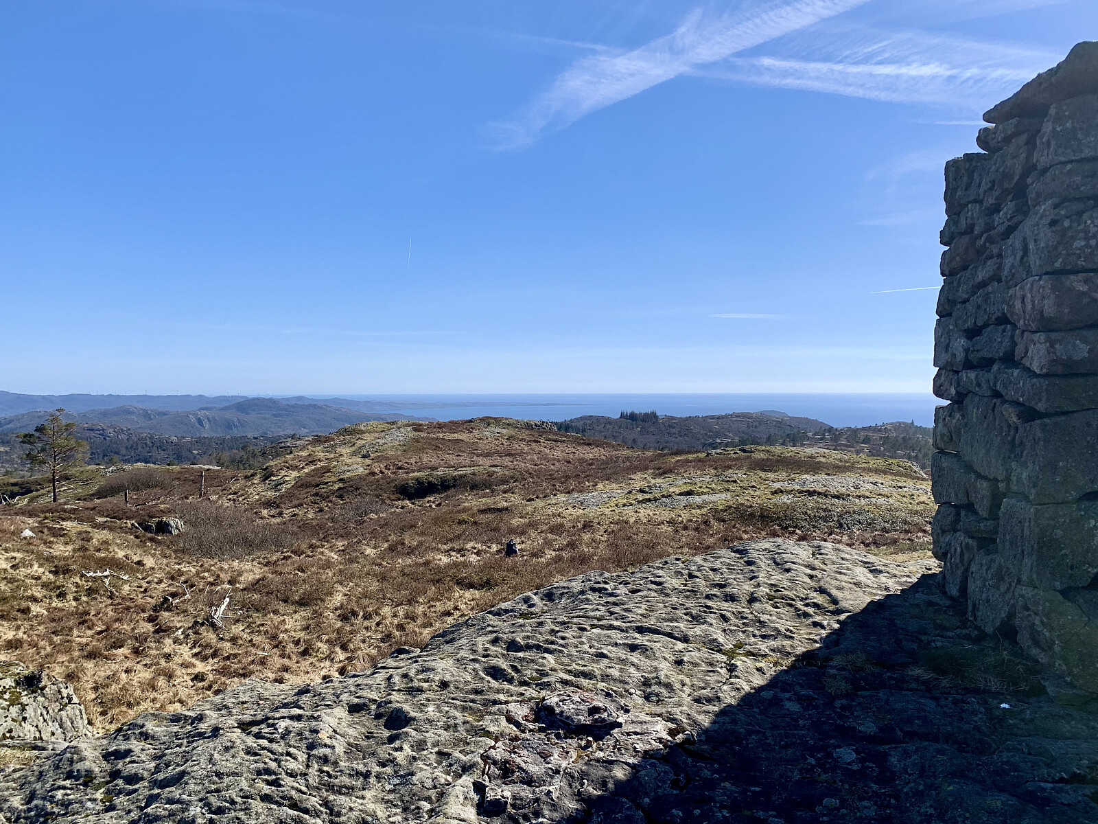 Tur fra Ropeid gård. Tur på skogsvei nordover parallelt med Saudavegen. Fra Slåttemyra var det ikke mer vei, men vi kløyv ganske bratt opp mot toppen og kunne av og til følge noen dyretråkk. Stor mast på toppen. Flott utsikt mot Vindafjorden, Sandsfjorden og Hylsfjorden.