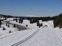 Fin dag på Sjusjøen, varmt, litt vind, sol fra skyfri himmel. Godt skiføre, tenkte å gå på toppunktet på Gjesboåsen, men det var en blanding av skare og skavler så jeg droppet det.