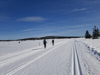 Fin dag på Sjusjøen, varmt, litt vind, sol fra skyfri himmel. Godt skiføre, tenkte å gå på toppunktet på Gjesboåsen, men det var en blanding av skare og skavler så jeg droppet det.