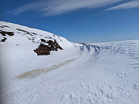 En flott skitur i Lierne. Parkerte ved Mellomvatnet og gikk opp til en traktorvei ovenfor gården Brattland, en gård som bærer navnet sitt med rette. Herfra gikk det et scooterspor nesten helt til toppen. Sol hele dagen, men en del kraftige vindkast på toppene. Varde på toppen. Tidligere var det Hestberget som ligger to kilometer lenger nord som var regnet som høyest, men det var fire meter lavere. Total lenge på turen ble 10,7 kilometer.