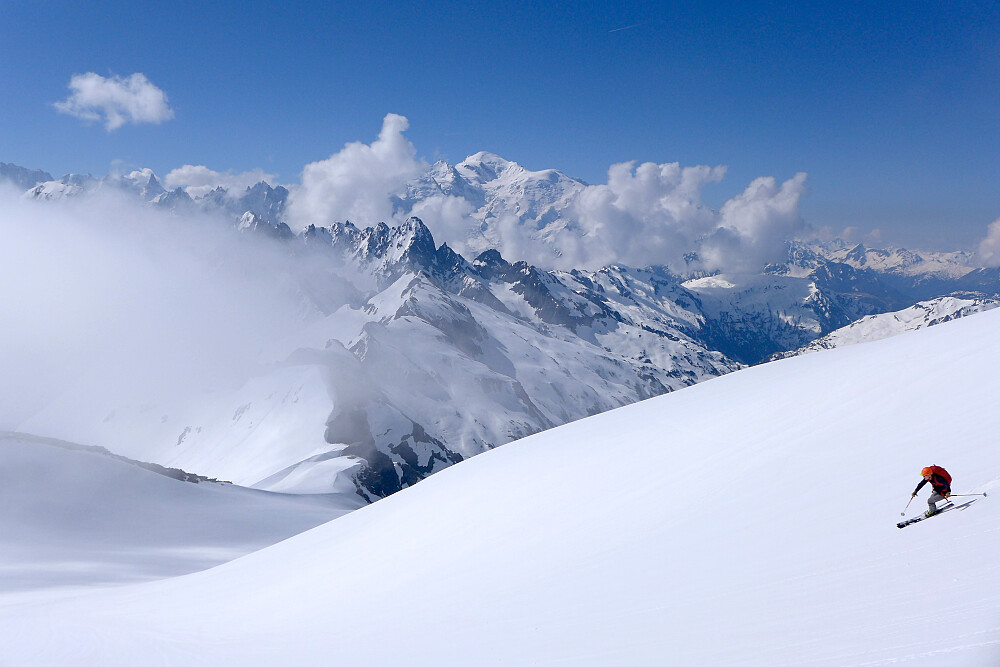 Etter det bratteste parti gikk vi en slags travers og litt bortover. Dette satte jeg pris på siden jeg fikk kjenne på at jeg ike var akklimatsert i det hele tatt. Snøen var påvirket av sola i stor grad og forholdene varierte veldig avhengig av eksposisjon. Etter hvert traff vi den sørvendte ryggen på ca. 2650moh der vi hadde to alternativer. Enten kan man fortsette rett frem og gå opp den sørvendte flanken under sørvestryggen, eller følge dalformasjonen innover for så å gå opp en ryggformasjon med ski på sekk. Vi gikk på ryggen siden det var en relativt god sti her og det var uansett deilig å gå. Det var stort sett snøfritt og det ble til sammen kanskje 100hm før vi kunne gå siste biten med ski på beina. Ble litt klabbing på skifeller siden det var litt nysnø som hadde blitt fuktet av sola. Utrolig irriterrende men det var ikke så langt å gå før vi skulle nå toppen – heldigvis. Etter omtrent 4,5 timer kom vi endelig opp på toppen av Mont Buet. Og for en utsikt vi fikk! Det var en kjempeflott utsikt i alle retninger men kontrastene var store. Mot vest/nordvest var toppene mer eller mindre snøfrie i motsetning til de hvite snødekte toppene mot sørøst i Mont Blanc-massivet. Kunne gjerne vært her en god stund lenger men allerede var noen skyene på vei og snøforholdene i sør- og østsidene ville bli raskt dårlige pga solpåvirkning så vi ville utnytte muligheten for å kjøre fin vårsnø og ikke ble lenge på toppen. Kanskje 10-15 minutter. Det var lenge nok til å ta bukse på meg og smøre med solkrem igjen før vi begynte å kjøre ned! Vi kjørte ned omtrent samme vei som vi hadde gått opp, med unntak av det lille partiet på ryggen der vi gikk med ski på sekk. Fra toppen kjørte vi et lite stykke ned på sørvestryggen før vi tok av mot venstre og droppet inn i den fine sørvendtflanken hvor det var noen folk som var på tur opp.