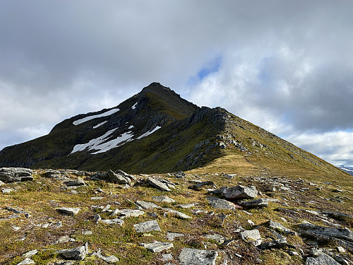 On the other side of the river, we found the trail up to Mount Middagshornet. The trail went past 3 ponds (see map), and then took us up to a mountain ridge that goes all the way up to the summit of Mount Middagshornet. The ridge first goes in a southwest direction, but at about 800 m.a.m.s.l. there's a nice viewpoint, and at that viewpoint the ridge turns left, and from there it takes a southeast direction all the way up to the summit. The viewpoint mentioned offers a very nice view to Mount Klovetinden as well as to all the surrounding valleys. Mount Middagshornet is located directly south of the village of Barstadvika. The Norwegian word middag means mid-day [i.e. noon], and I believe the mountain got its name because people in Barstadvika back in the old days used the mountain to know when it was noon; i.e. when the sun was right above this mountain, it was time to eat dinner.