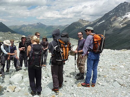 Once we'd driven to Arolla and parked up we began the walk in to the Dix hut. Mont Collon dominated the views at the top end of the valley, which stayed pretty much to our left. The air was warm but not too intense. At about halfway to the hut we reached a nice grassy plateau and stopped for some lunch. It was probably quite fortunate we stopped at that point, because about ½ hour later, just as we’d arrived at the start of the ladders that descended down to the glacier, it started to rain lightly and then became heavier once we’d begun the glacier crossing. Fortunate that we weren’t far from the lovely warmth of the hut. We ended up spending the remainder of the afternoon drinking masses of tea/coffee, playing cards and after it had stopped raining and doing some ropework practice outside the hut. Dinner was a bit of a cosy affair, with every single table crammed to full capacity but despite that, the soup was a tasty vegetable concoction followed by some surprisingly tender beef casserole with mashed potato (a rather odd combination in my opinion) and an interesting dessert of pears with chocolate sauce. I was in bed by 8.15pm, and the dormitory filled up not too long after; we appeared to be in good company because the old geezers sharing the room with us didn’t appear (to my knowledge) to have any snoring issues. Actually, it was probably Hanna who made the most noise snoring with her blocked nose that night!
