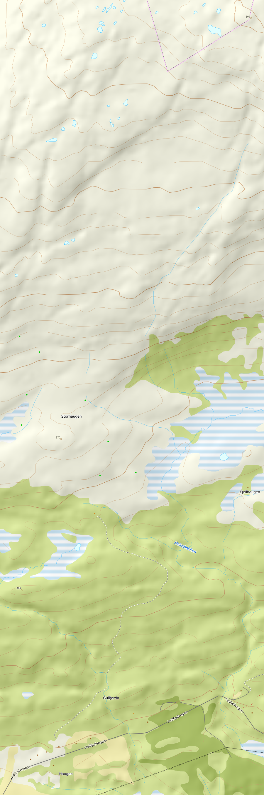 Jeg kjørte til Hellfjellbygda og parkerte langs veien her. Fra Haugen gård fulgte jeg en traktorvei oppover gjennom skogen som førte til ei hytte rett sør for Storhaugen. Jeg tok ut fra veien like før hytta og gikk i flott fjellterreng oppover til toppen. Sola skinte, en stor og staselig varde på toppen og en herlig utsikt i alle retninger. Helt fantastisk! I vest kjente jeg lett igjen De Syv Søstre ved Alstahaug og sørover flere av de mindre toppene jeg hadde besøkt dagene før.