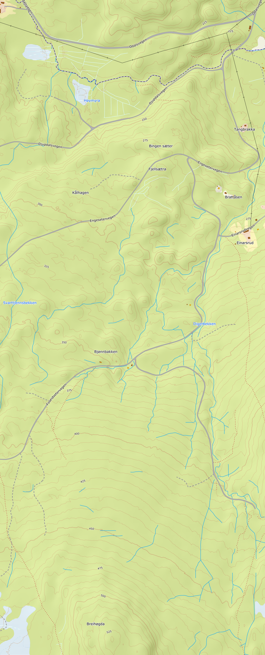 Jeg parkerte i krysset vest for Geittjennet og fulgte veien helt opp til den dreide rett vestover i 420 meters høyde. Helt opp hit var veien brøytet og det er mulig at jeg kunne kjørt dette stykket, men tok ikke sjansen. Videre opp til toppen var det dyp snø, og da kom trugene jeg hadde festet på sekken godt med. Det var flere fine utsiktspunkter underveis retning nordover, men på selve toppen var det bare trær å se. Jeg fant heller ingen markering av toppunktet, mulig det lå under den dype snøen. Samme vei tilbake.