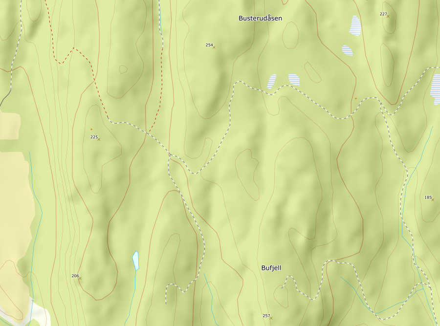 Et godt utgangspunkt for tur opp til Bufjell er parkeringsplassen i Vebergveien. Herfra fulgte jeg traktorveien videre til jeg var NV for toppen. Ruta videre går i en solid runde rundt fjellet, men jeg tenkte å ta en snarvei rett opp mot toppen... Dette var rett og slett et dårlig valg og jeg tror ikke at jeg sparte noe tid i hele tatt, snarere tvert om! Her var det veldig ulendt og til tider vanskelig å ta seg frem. Men jeg kom da opp til Bufjell til slutt og gikk opp til den høyeste kollen. Her var det verken markering eller utsikt, og ikke noe mål for andre enn toppsamlere. Hundre meter bortenfor derimot var det et fint utsiktspunkt med bart fjell flere steder.