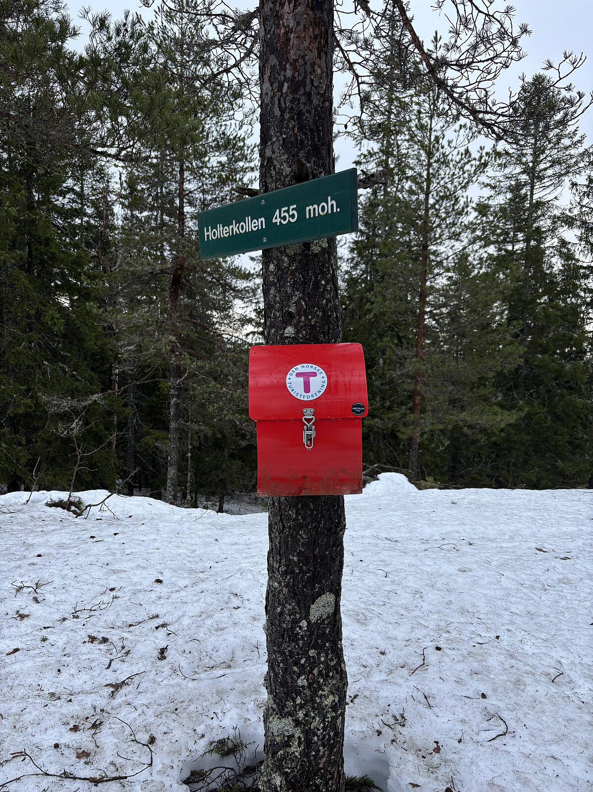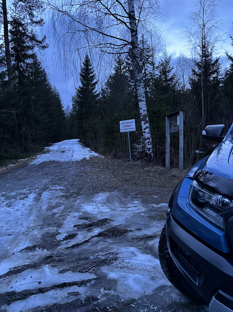Holterkollen:Parkerte ved Holterkollen parkering. Her måtte jeg gå et stykke på vei, før det ble vassing i snø de siste par hundre meterne til toppen.
