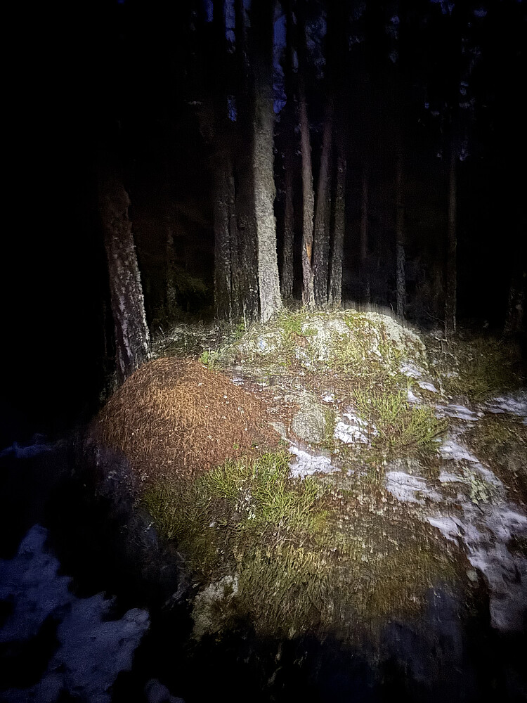 Holtfjellet: Parkerte ved Henni p-lomme. Bommen var åpen, men tok ikke sjansen på å kjøre skogsbilveien pga. skiltet. Etter veien ble til traktorvei, fulgte jeg den litt, før sti siste biten til toppen. Gardermoen lyste opp himmelen i mørket.