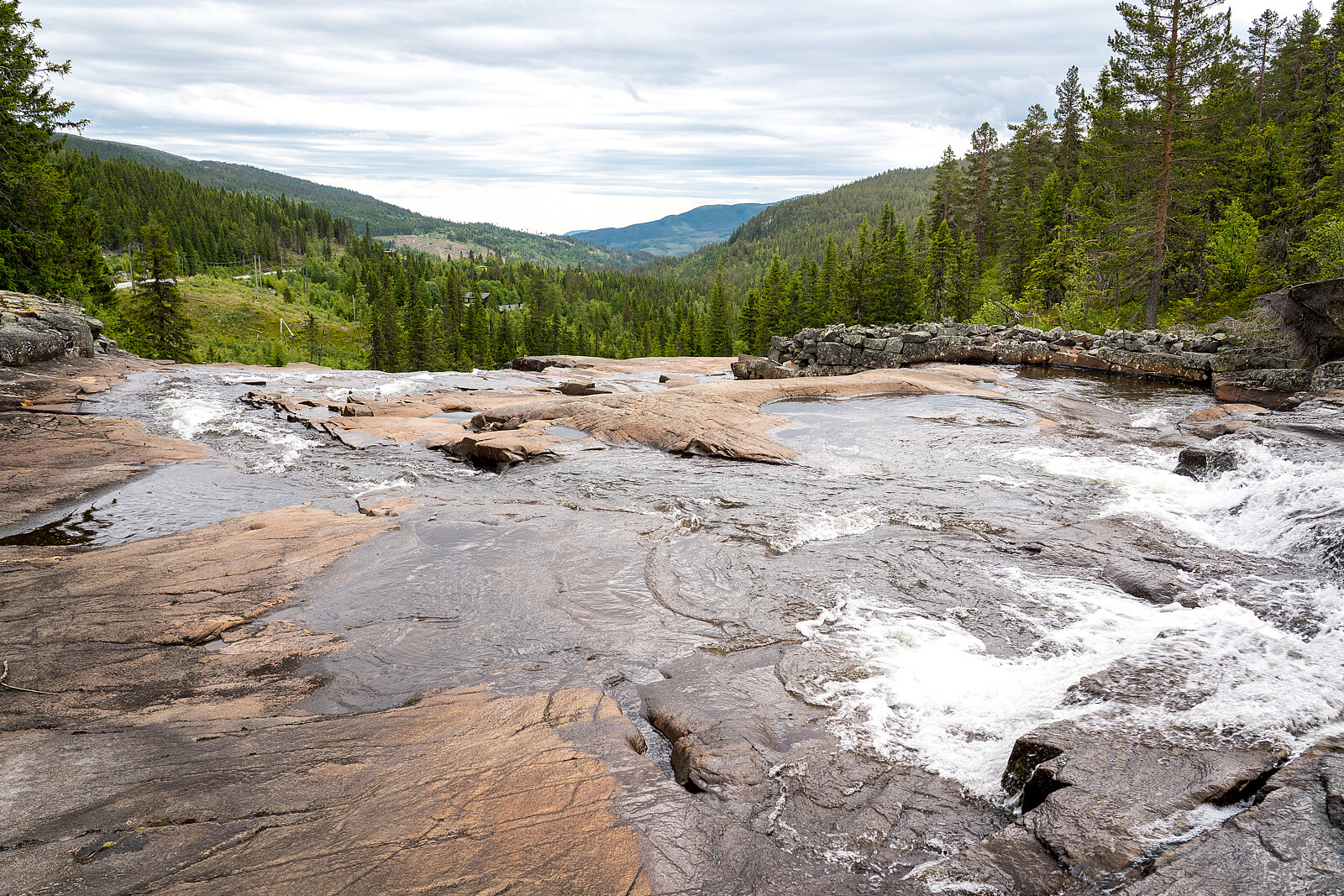 Relativt lite vann i bekken så kunne bevege meg nedover på svaberga mot fossen. Kom ut mot stupet og så her at det nesten var en naturlig trapp i østsida av fossen. Så bevegde med nedover og endte ute på ei “øy”. Kom meg ikke helt ned da de siste høydemeterne gikk over i stup. Fra “øya” var det noe bedre utsikt mot hovedfossen, som “lider” litt av disse trappeformasjonene. Vanskelig å få enkel ferdsel og fritt fall i samme foss. Fint område uansett, verdt de 900 meterne.