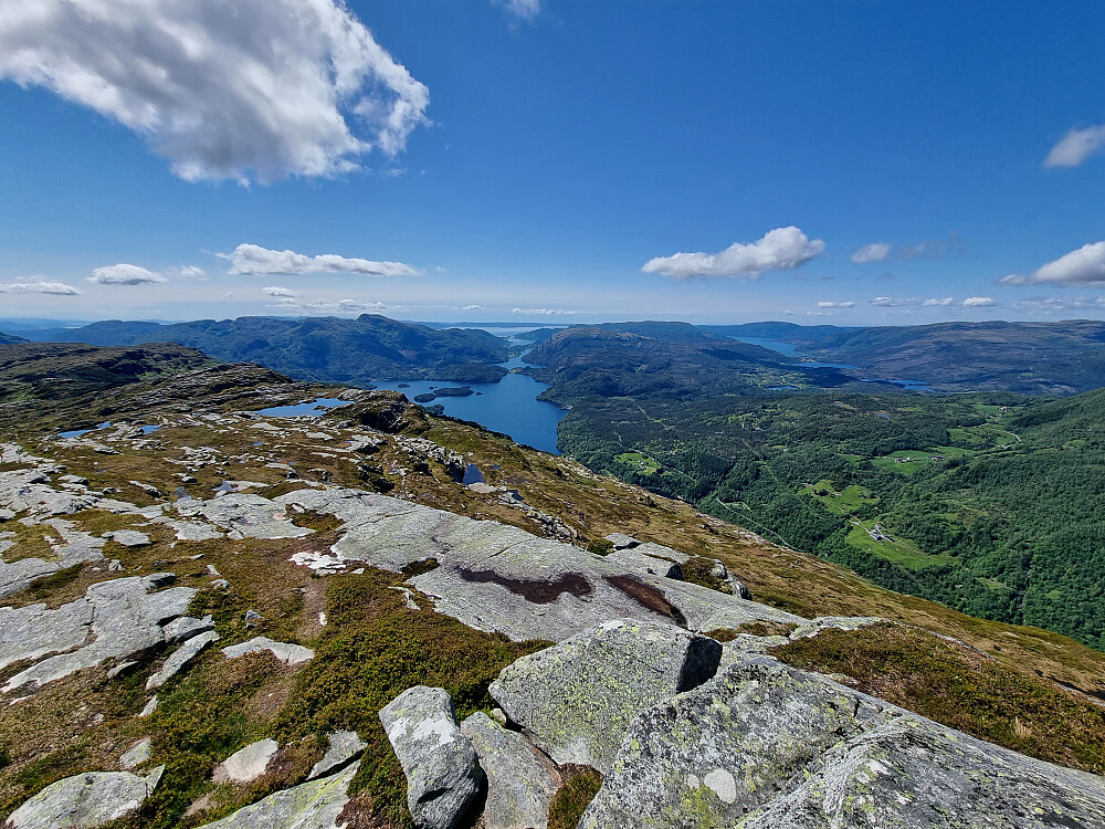 Neste turmål var Ørnnotta. Det var ingen sti å finne her, så da var det å lese kartet og finne en passende rute. Videre mot Daurmålsegga var planen å komme inn på stien som går opp fra Raudkleiv, og der var det fin sti opp til toppen. Her var det fantastisk utsikt i alle retninger. En person hadde satt opp telt like ved toppen. Det var nesten ikke vind, så her var det bare å nyte tilværelsen og utsikten. Fra utsiktspunktet gikk vi bort til hovedtoppen og så videre bort til Orraaksla. Fin utsikt mot Gjønakvitingen og Tveitakvitingen. Neste turmål var Storefjellet (Storafjell på kartet). Her var det stort sett ingen stier, men greit terreng.