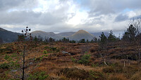Rett før kl. 9 var det 3 grader og oppholdsvær ved Osavatnet. Etter et kort stykke langs veien tok jeg av på stien oppover Ormarinden. Stien er bra, selv om det i dag var ganske vått på bakken. Etter en drøy halvtime var jeg på toppen av Herlandsfjellet . Fra nordvest kom det inn mørke skyer, og det ble først regn og deretter sludd. Sikten var tidvis veldig dårlig. Planen var å gå runden om Skåldalsfjellet, men det fristet ikke nå. Det var kaldt og vått, og fjellene var innhyllet i skyer. Så hva nå? Jeg fulgte samme vei tilbake til Osavatnet og bestemte meg for å gå på de fire toppene mellom Osavatnet og Espeland.