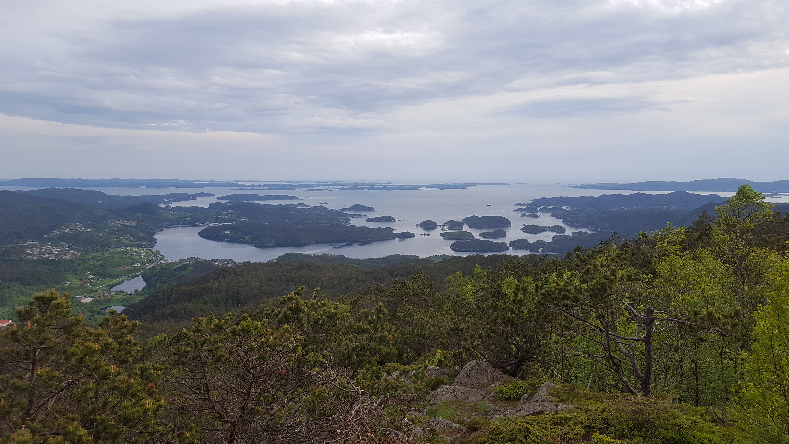 I dag ble det løpetur på langs av Solbakkefjellet, som ligger mellom Kalandsvatnet og Sveningen. Det var i underkant av 10 grader, men litt småkjølig i dalbunnen. Jeg så sol høyere opp på fjellet, så jeg håpet at det ville bli varmere der oppe. Fra starten sør for Gimmeland fulgte jeg grusvei før det tok av en sti som var godt skiltet og merket med gule treklosser. Etter hvert som jeg kom opp på fjellryggen ble utsikten bedre og bedre. Fra toppen er det vid utsikt i alle retninger. Det var en del skyer og tåke, men også glimt av sol og blå himmel.