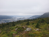 Det var meldt sol i dag, men det skulle vise seg å bli mye tåke istedenfor. Jeg tenkte å besøke en del av hyttene sørøst for Ulriken. Fra Helgeseter fulgte jeg grusvei, før jeg tok av på sti oppover mot Landåsfjellet. Jeg passerte Nubbevatnet og etter hvert Stemmevatnet, selv om sistnevnte var skjult i tåka. Videre over Vasslifjellet før jeg etter hvert dreide østover til Haukelandsvarden. Dårlig utsikt her på grunn av lave skyer. Jeg løp deretter til Hauggjelsvarden og Byfjellenes høyeste punkt. Planen var nå å besøke hytta Skjulet. Det var tåkete og dårlig sikt, så det ble kompassgang kun med kart på mobilen til hjelp. Jeg kom litt for langt øst, men plutselig dukket hytta opp. Etter dette var det kort vei til jeg var inne på hovedstien over Vidden. Det var ganske >>>