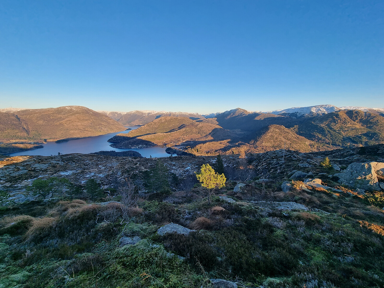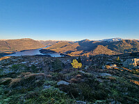 Det er sti oppover ryggen. Stort sett er den grei å følge, men vi mistet stien på et punkt i starten. Fin utsikt fra toppen. Videre mot Tverrfjellet var det greit, med litt tråkk og sti innimellom. Siden det var frost i bakken, kunne vi gå direkte over >>>