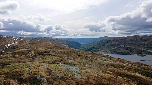 After reuniting, we came across a weak trail that we followed north of the lake where it seemed to continue west. We instead made our own way northeast up the small ridge, but soon realized that this was a mistake as it would take us in the wrong direction. To correct our error we tried turning northeast, but the hilly terrain from the end of our ascent to Gråfjellet was now back, with lots of steep small cliffs that had to be avoided. When we later came across another trail at the southern end of Klenavatnet, we therefore decided to follow it, even though it was not heading exactly in the wanted direction.