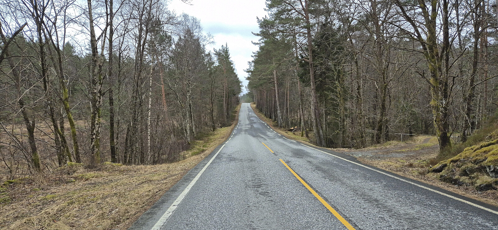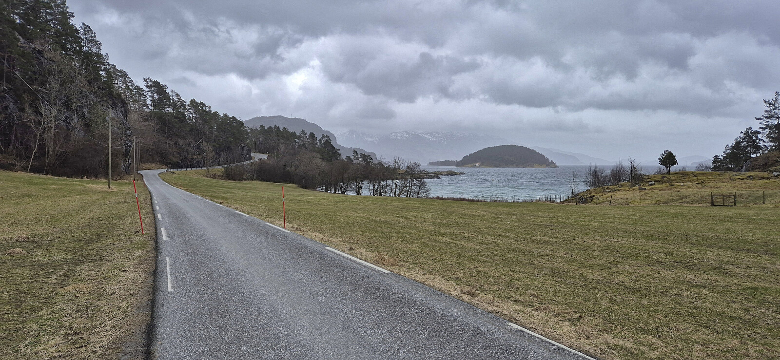 By taking the bus (and ferry) south from Solstrand, I got as far as Stussvikhovda snuplass from where I had to walk the remaining 4.3 km to the start of a tractor road southwest of the summit. Note that unless you count the grass-covered area on the outside of the guard rails, which I partially made use of, there were no sidewalks, however the traffic was thankfully limited.